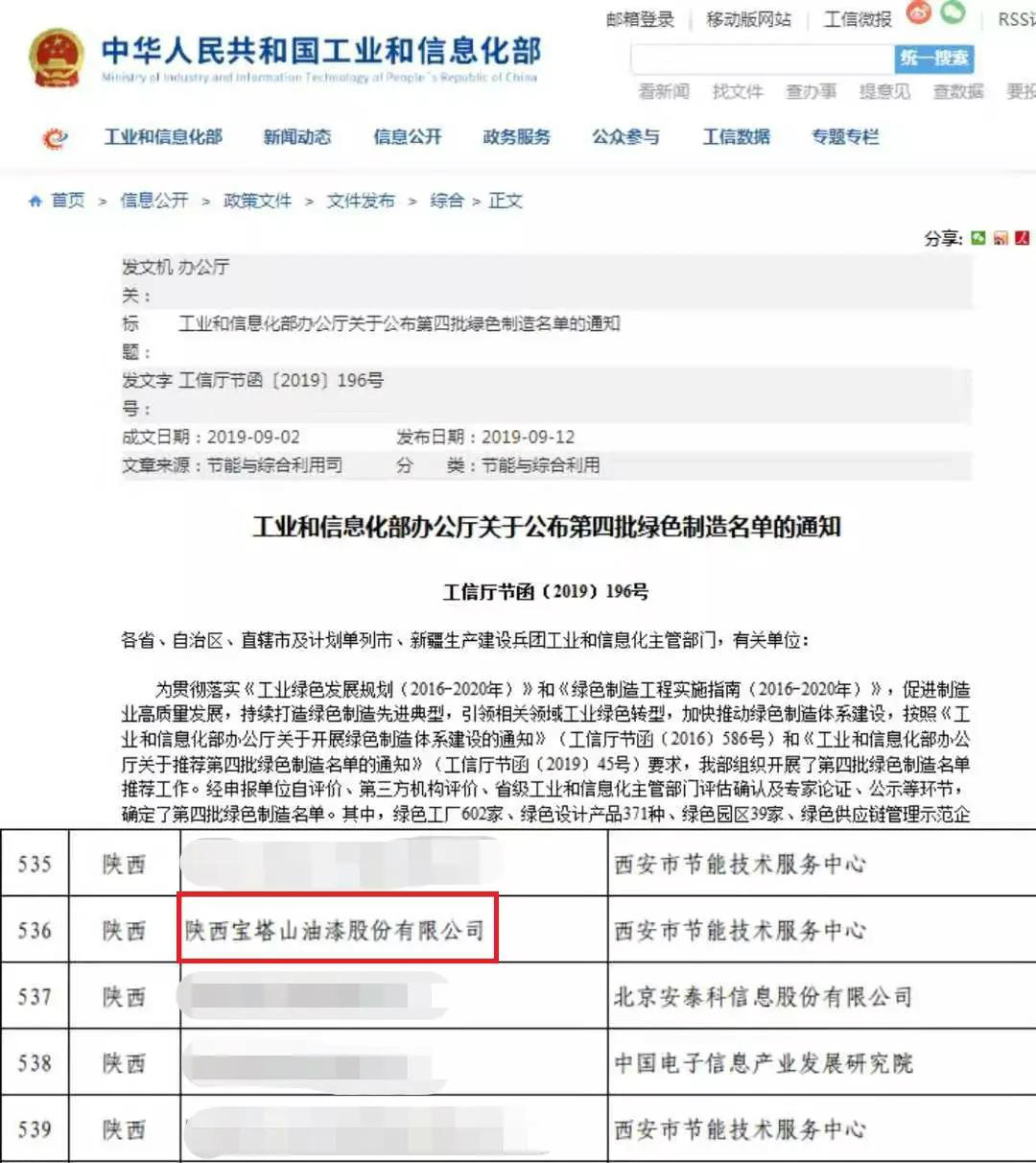 2019年9月12日,國(guó)家工業(yè)和信息化部辦公廳公布了第四批綠色制造名單,其中陜西寶塔山油漆股份有限公司被認(rèn)定為國(guó)家級(jí)“綠色工廠”。